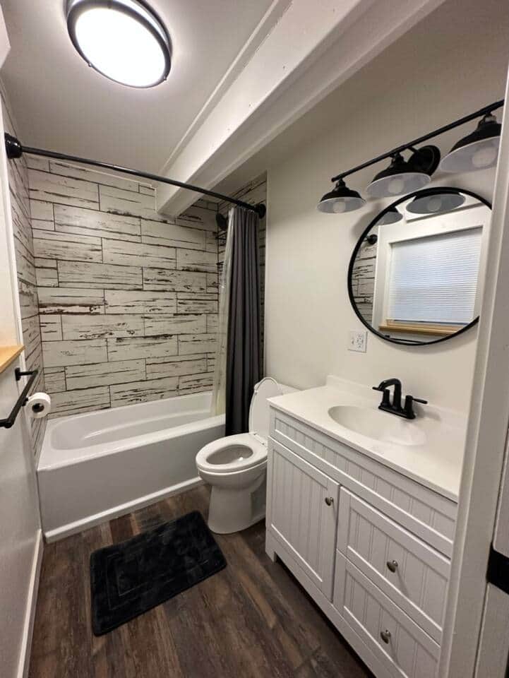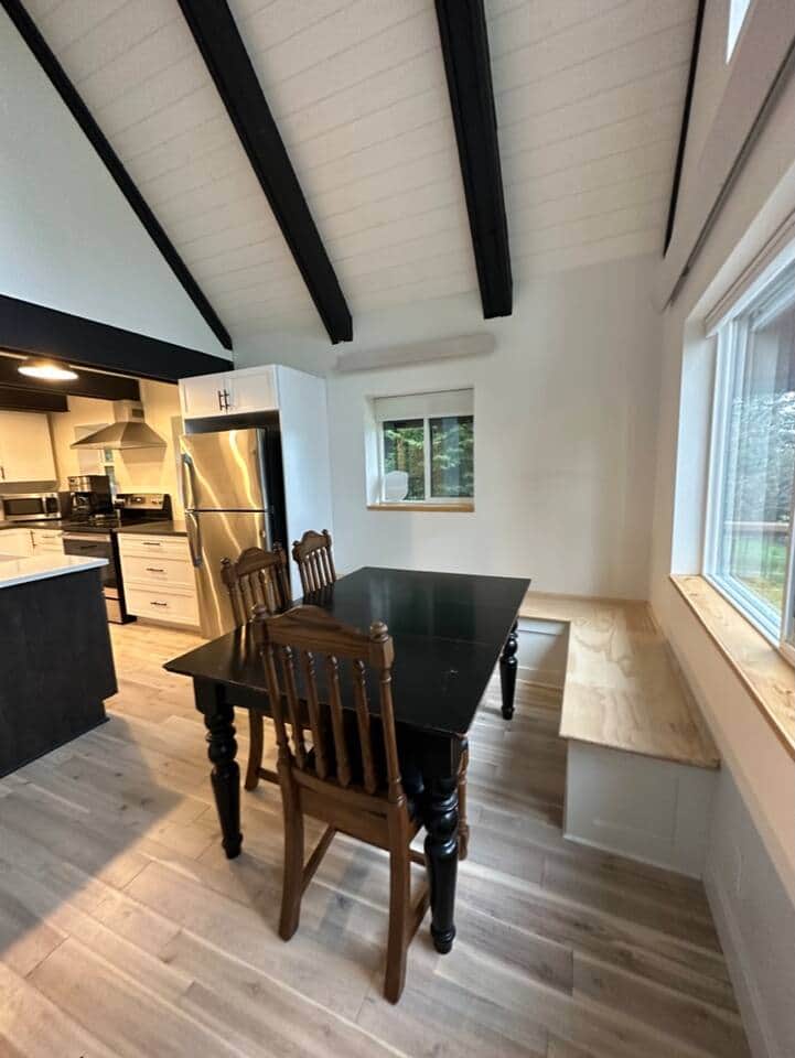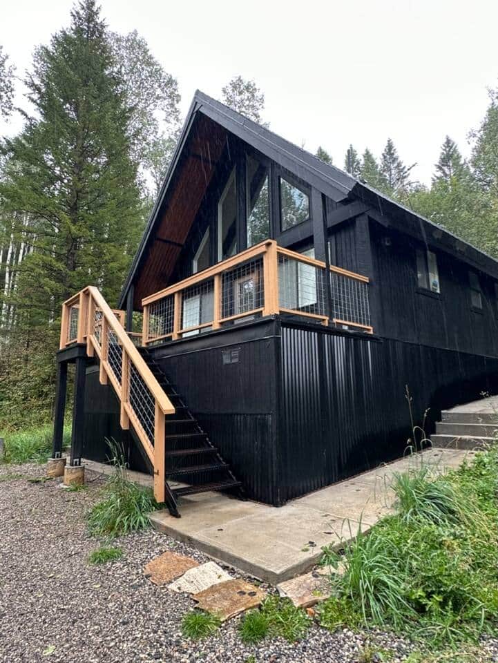 We want all of our guests to know for safety reasons, we are across the street from the pond and the home does require climbing metal stairs to access front door. The a-frame construction of the home also leads to a steep wooden stair case to access the upstairs room.